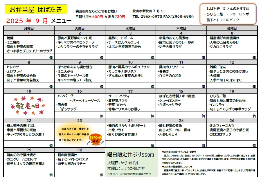 🍇お弁当屋はばたき 9月メニュー表🍠 2025年8月27日 最終更新日時 : 2025年8月27日 ワークアップさやま 多機能型支援施設はばたき こんにちは!お弁当屋はばたきです。 9月のメニュー表が完成しましたので掲載致します。 狭山市内でしたら、どこへでもお一つから配達させて頂きます🚚 皆様からのご注文をお待ちしております☎️🎶