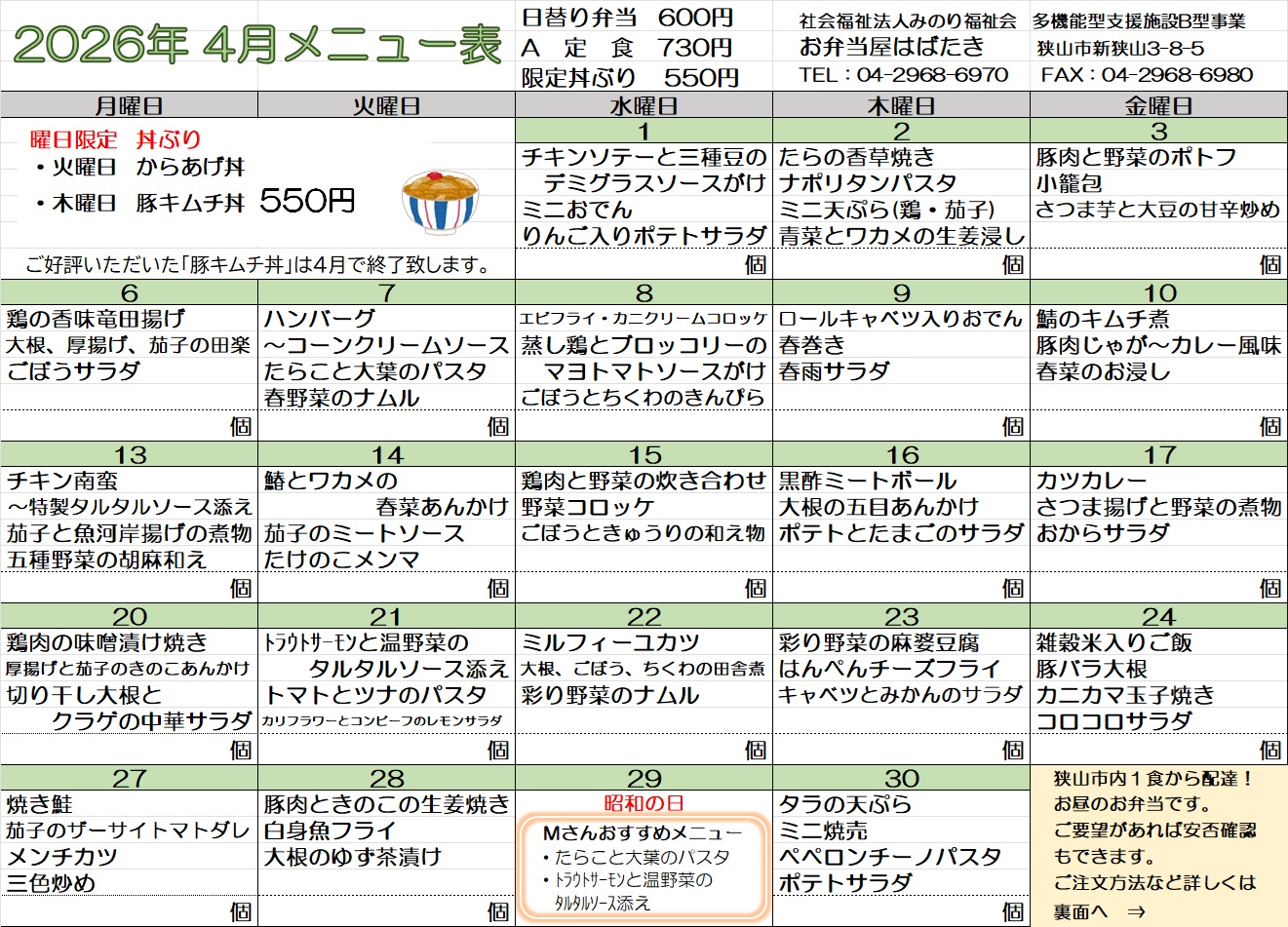 🥔お弁当屋はばたき 4月メニュー表🌸